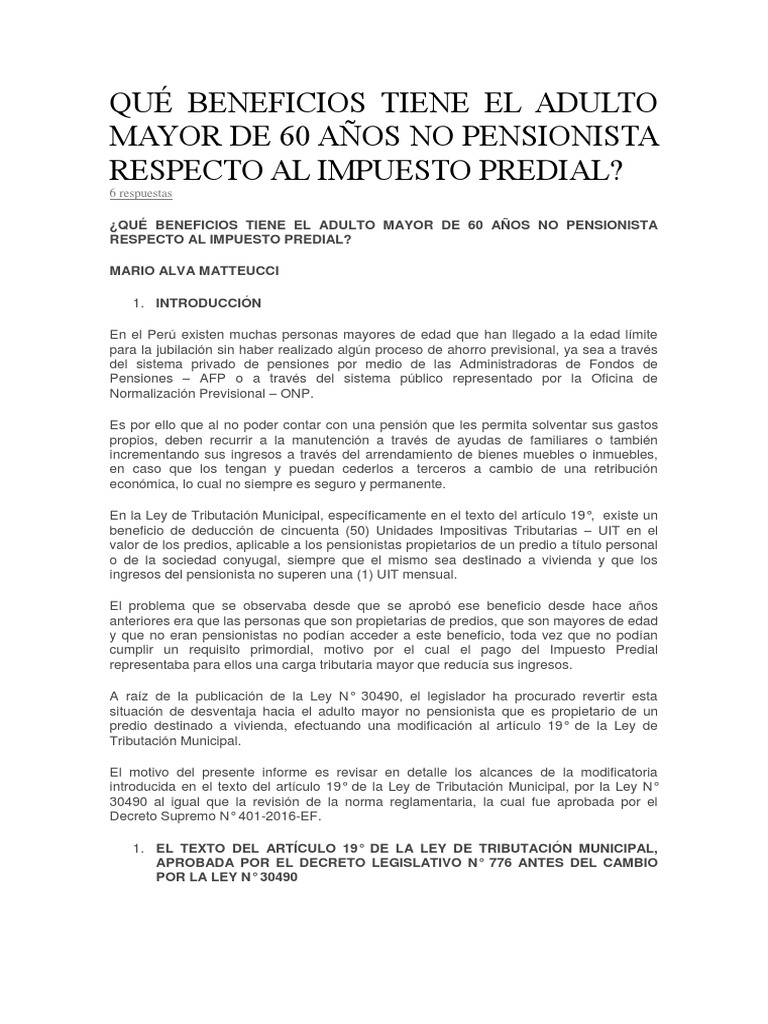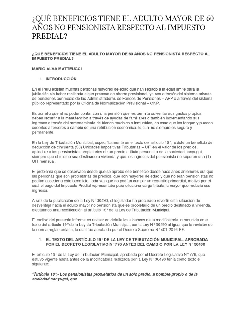 Así es existen beneficios para toda persona pensionista en nuestra sociedad, es decir nuestros amigos jubilados estan exonerados del pago del impuesto predial, dispuesto por la ley de tributación municipal o decreto ley 776 de 1994. De desventaja hacia el adulto mayor no pensionista que es propietario de un predio destinado a vivienda, efectuando una. Hoy 8 de enero a las 12.30 pm explicamos por @exitosape la ley 30490 ley del adulto mayor.no pagan impuesto predial desde el 01.01.1917. (ley 30490 publicada el 21 de julio 2016). De acuerdo a la ley no.